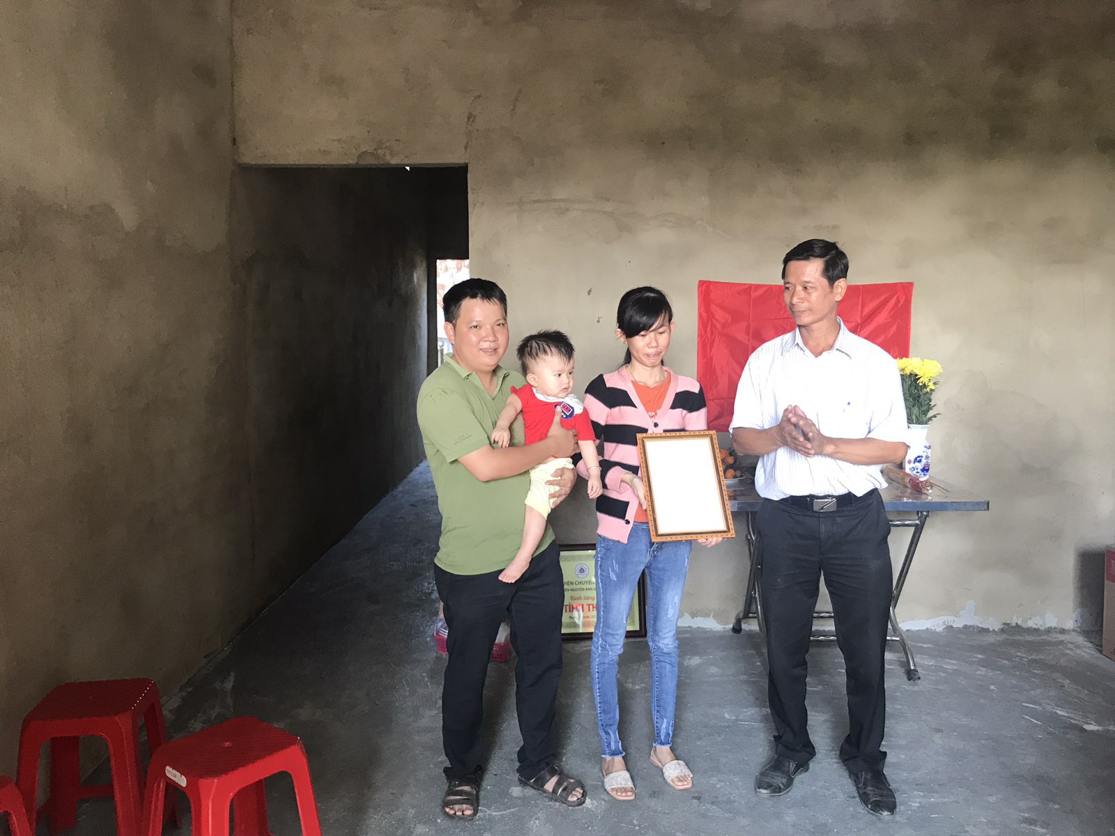 1. Căn nhà thứ nhất trao cho vợ chồng anh Lê Nghĩa – Trần Huỳnh Nga với số tiền 40 triệu đồng do Phân Ban Thiện nguyện Ánh Đạo Bình Dương vận động hỗ trợ; UBND xã Lộc An hỗ trợ thêm 05 triệu để vợ chồng có điều kiện làm căn nhà với diện tích 60m2 (ngang 4m, dài 15m)