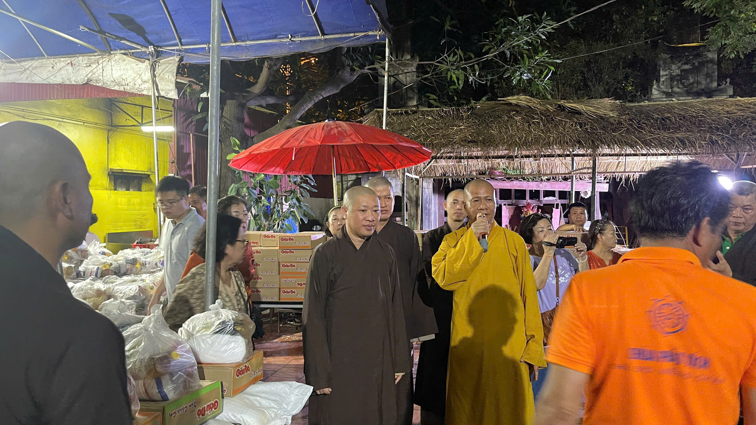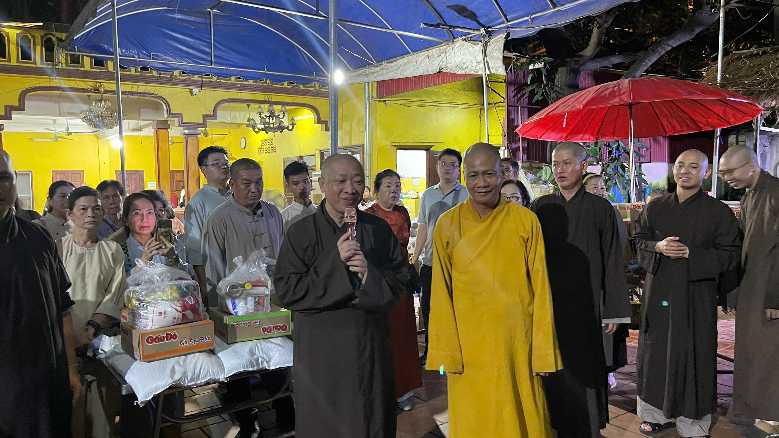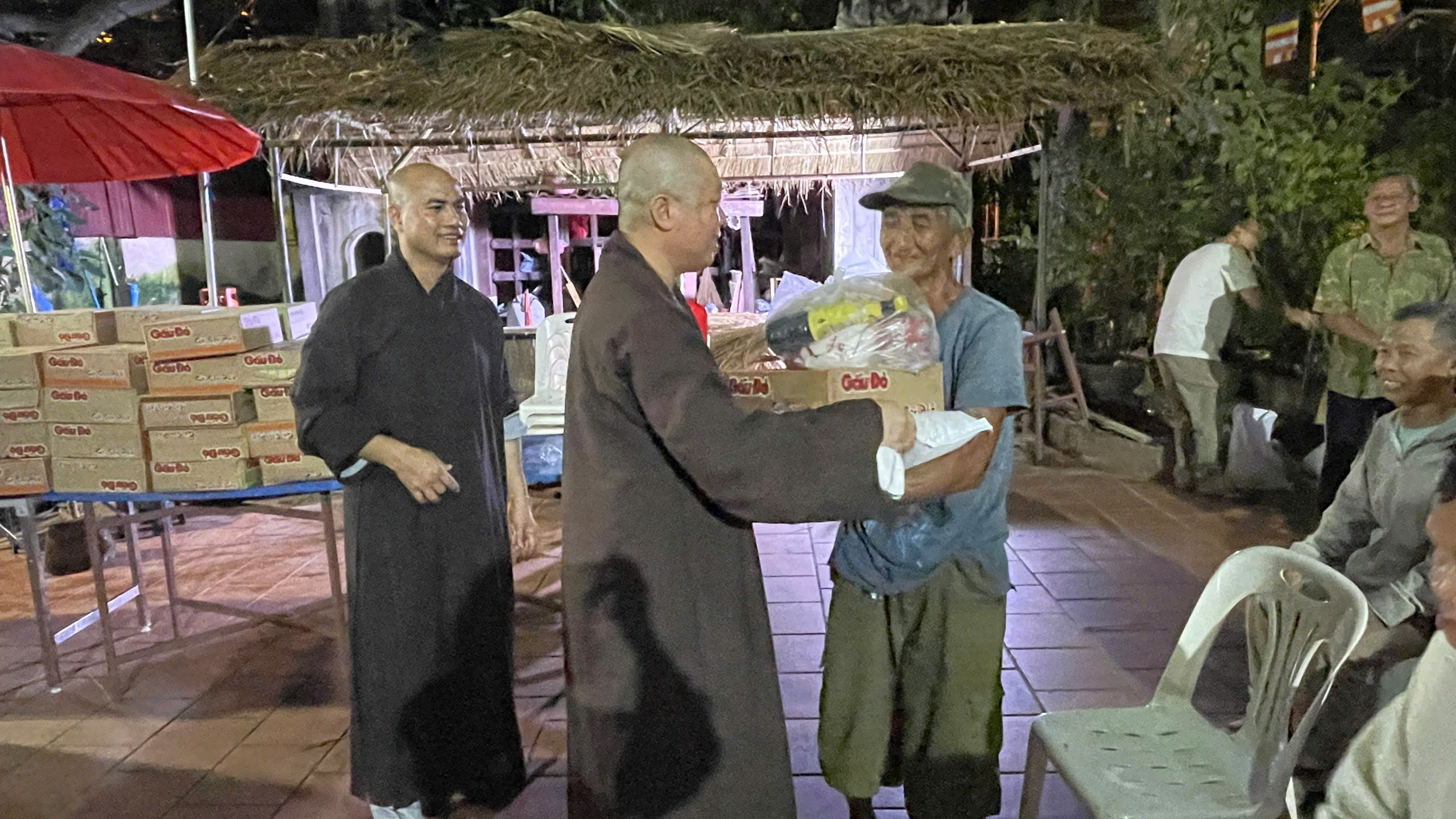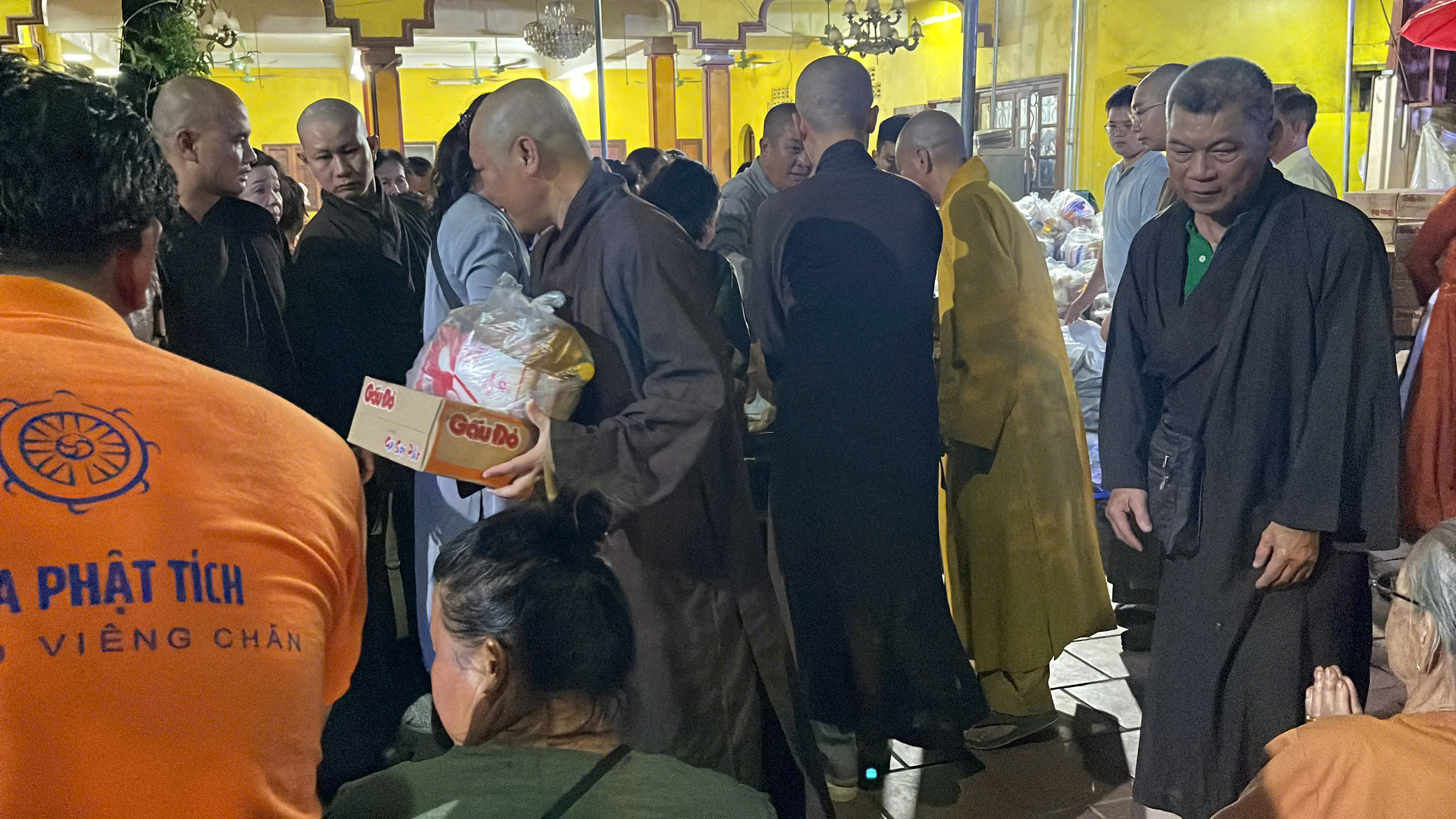 Sau thời thuyết giảng, bằng từ tâm yêu thương, nhường cơm sẻ áo của bốn gia đình Phật tử với tổng trị giá 50 triệu đồng gồm: Gia đình Hồ Thị Huỳnh Liễu (25 triệu đồng), Gia đình Phan Thị Kim Hoa (10 triệu đồng), Gia đình Nguyễn Minh Quốc (10 triệu đồng), Gia đình hương linh Phan Văn Thạch (5 triệu đồng), phái đoàn Viện Chuyên Tu đã kết hợp cùng chư Tăng và Phật tử chùa Phật Tích phát 100 phần quà (gạo, mì và nhu yếu phẩm) hỗ trợ cho những gia đình cơ nhỡ đang sinh sống tại Lào. Bao nụ cười hoan hỷ hé nở trên môi, ngàn kỷ niệm đẹp đọng lại chốn thiền môn Phật Tích trong chuyến hành hương của chư Tăng và Phật tử Viện Chuyên Tu nơi xứ Vạn Tượng.