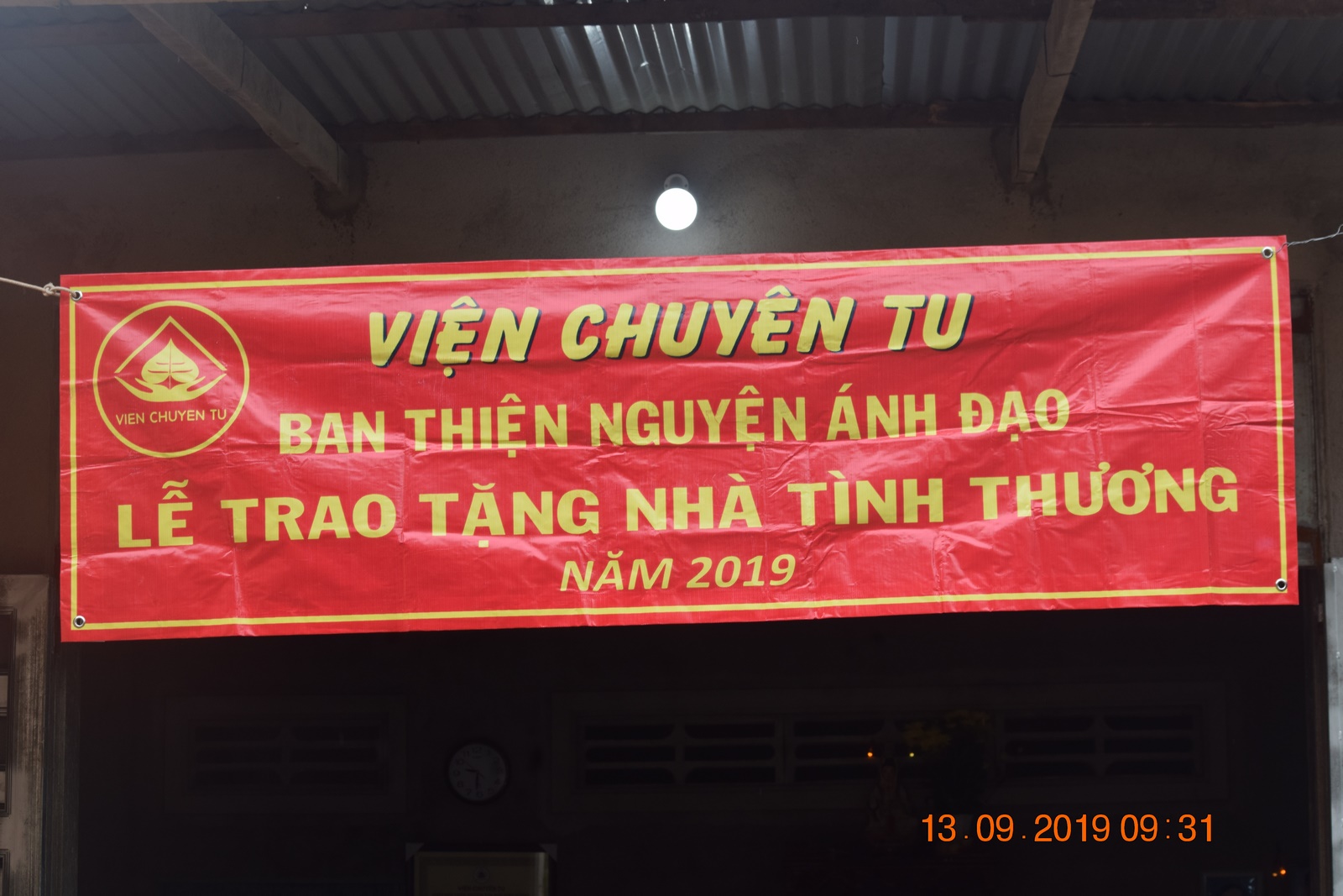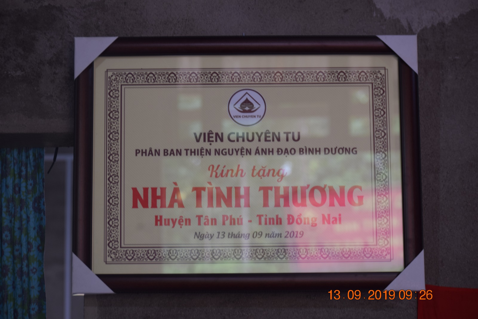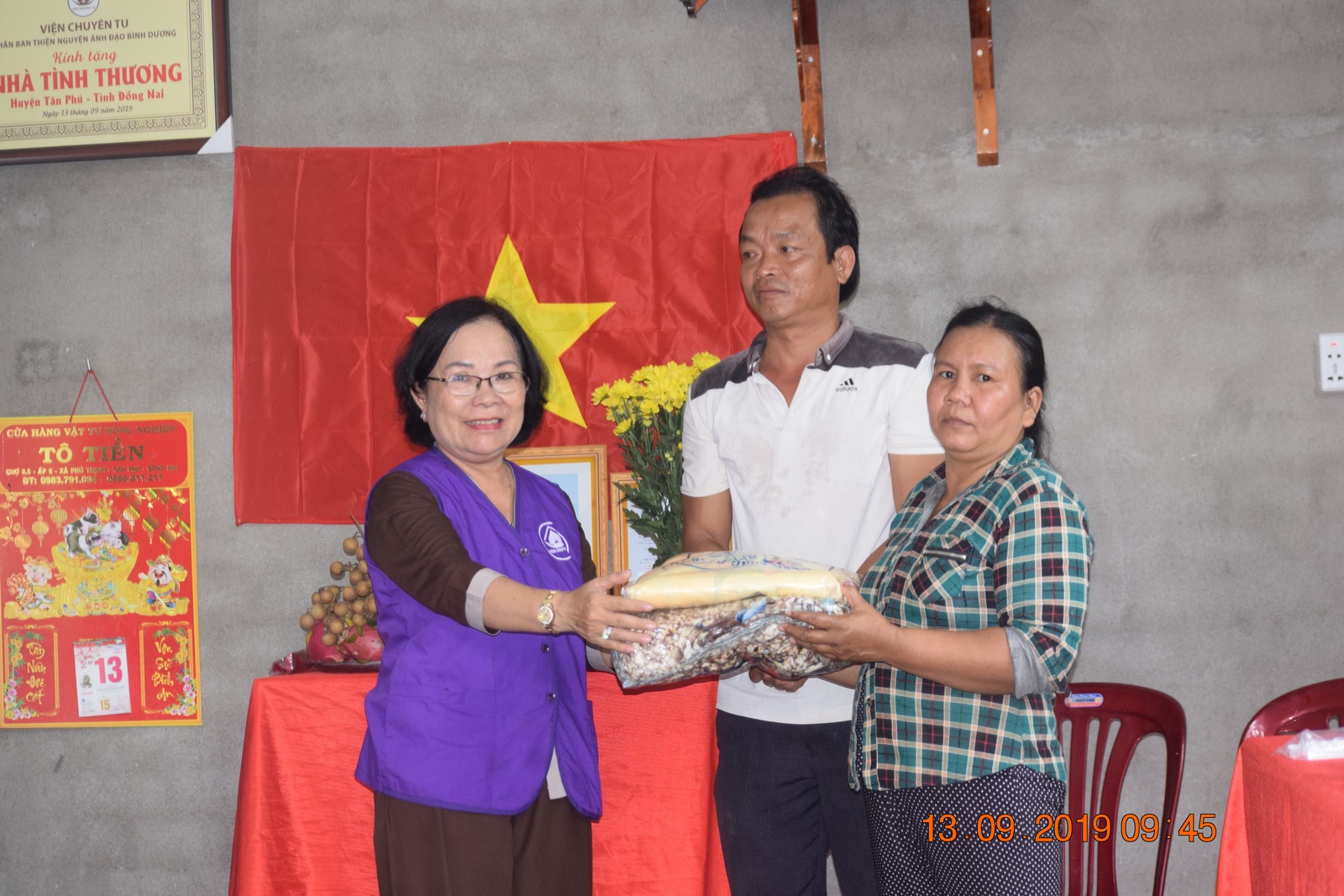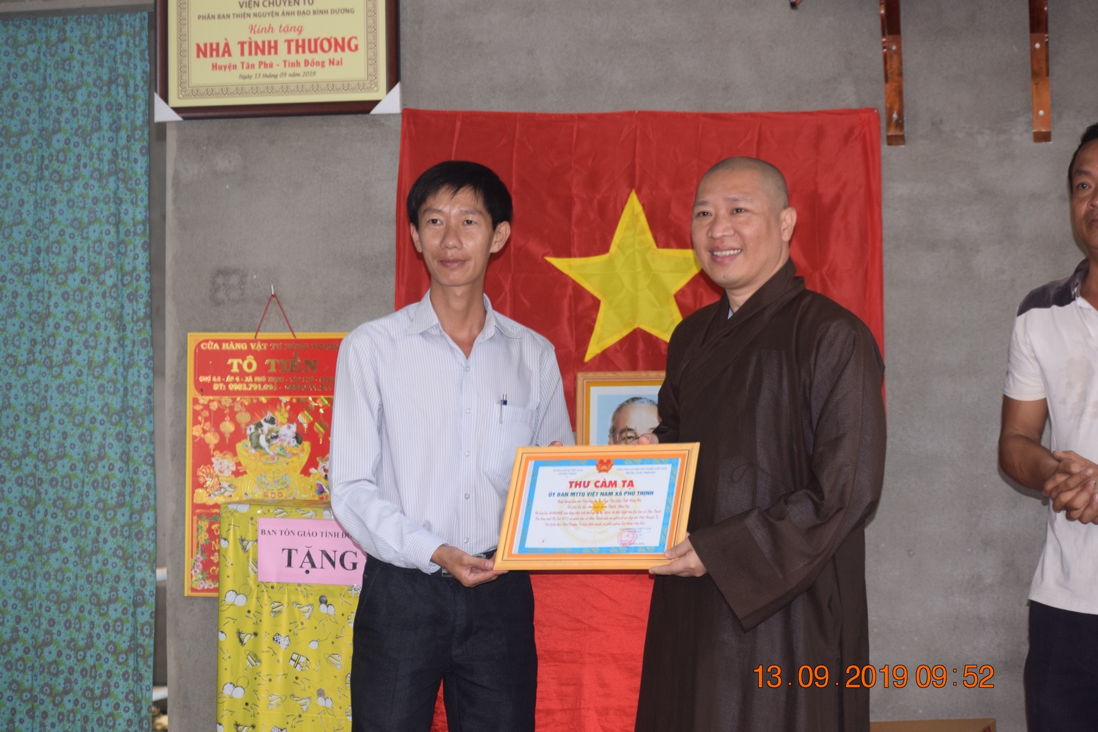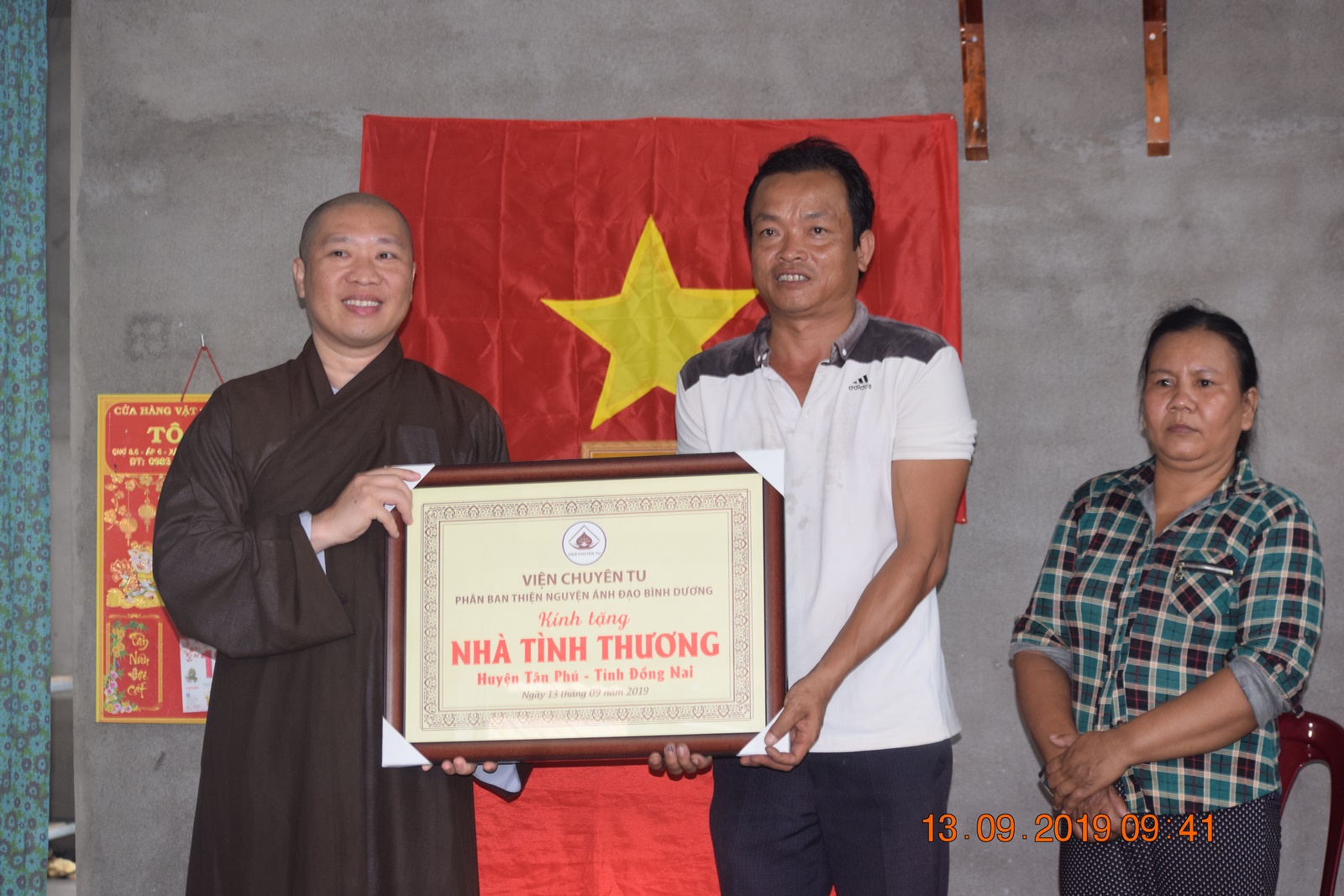 Sáng ngày 13/9/2019, Thượng tọa Trụ trì Thích Thiện Thuận cùng đoàn chư Tăng và Phật tử Viện Chuyên Tu trao căn nhà tình thương cho vợ chồng anh Lê Minh Thành cư ngụ tại Ấp 6, xã Phú Thịnh, huyện Tân Phú, tỉnh Đồng Nai.