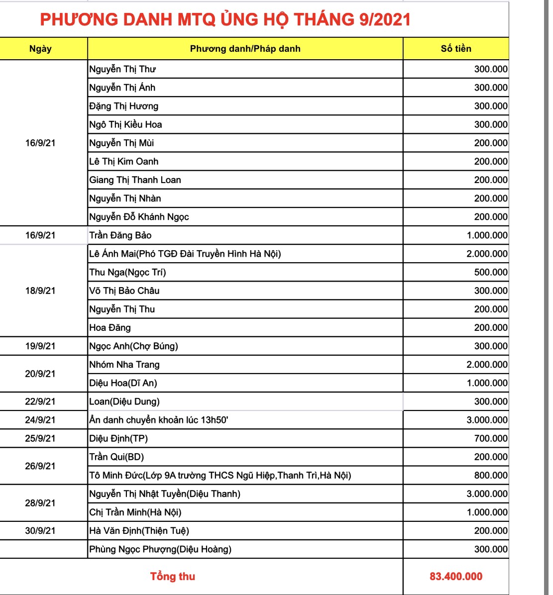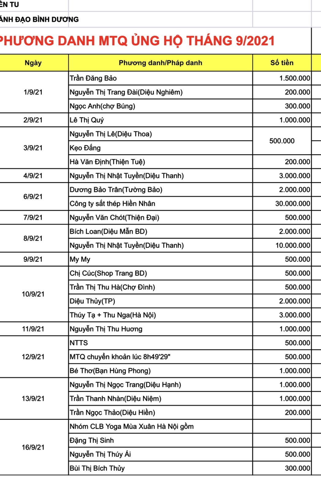 BTN xin cập nhật phương danh quý Phật tử cùng quý mạnh thường quân đã gửi tịnh tài để thực hiện các thiện sự trên. Số dư sẽ tiếp tục sử dụng trong tháng 10 /2021.