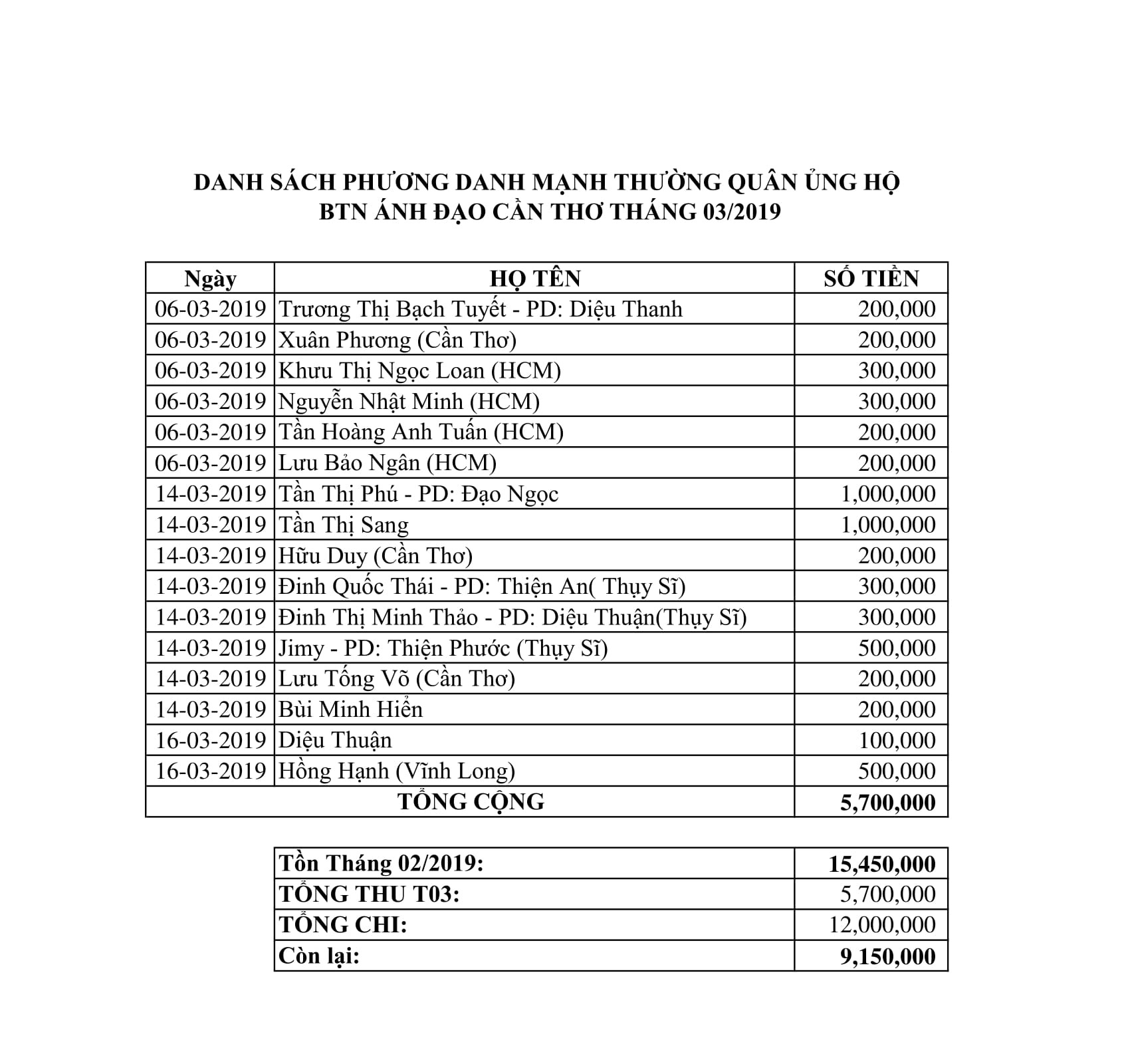 Tổng kinh phí Phân BTN Ánh Đạo Cần Thơ thực hiện trong quý 1 là 16.000.000 VNĐ (mười sáu triệu đồng).