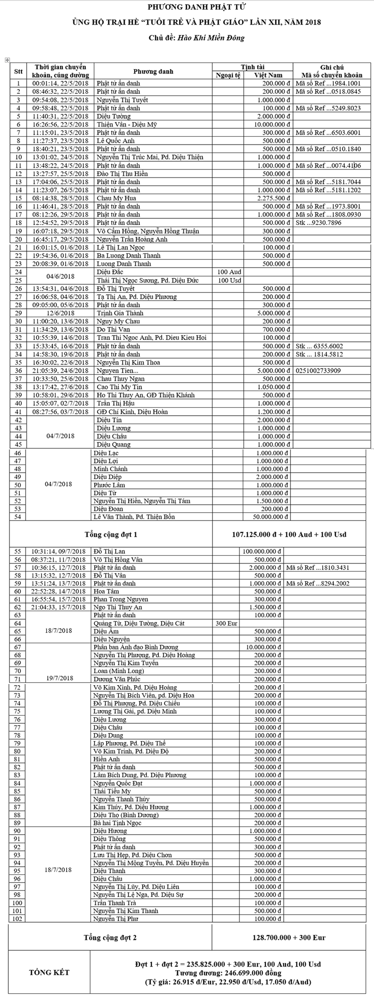 PHƯƠNG DANH PHẬT TỬ ỦNG HỘ TRẠI HÈ “TUỔI TRẺ VÀ PHẬT GIÁO” LẦN XII, NĂM 2018