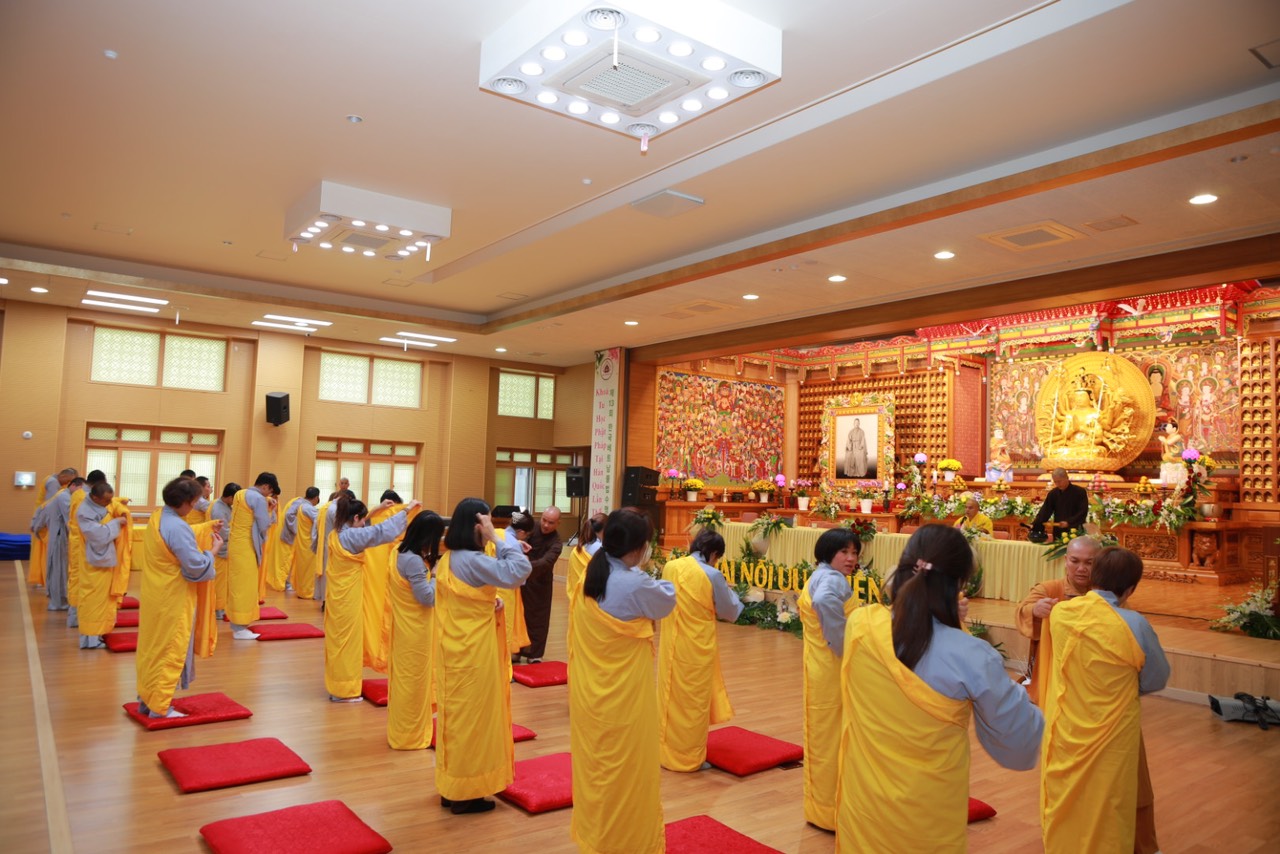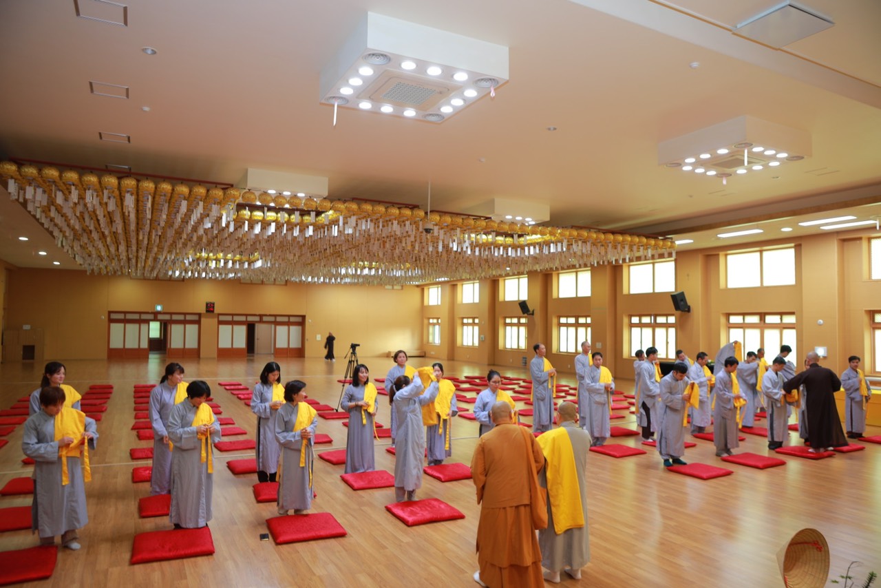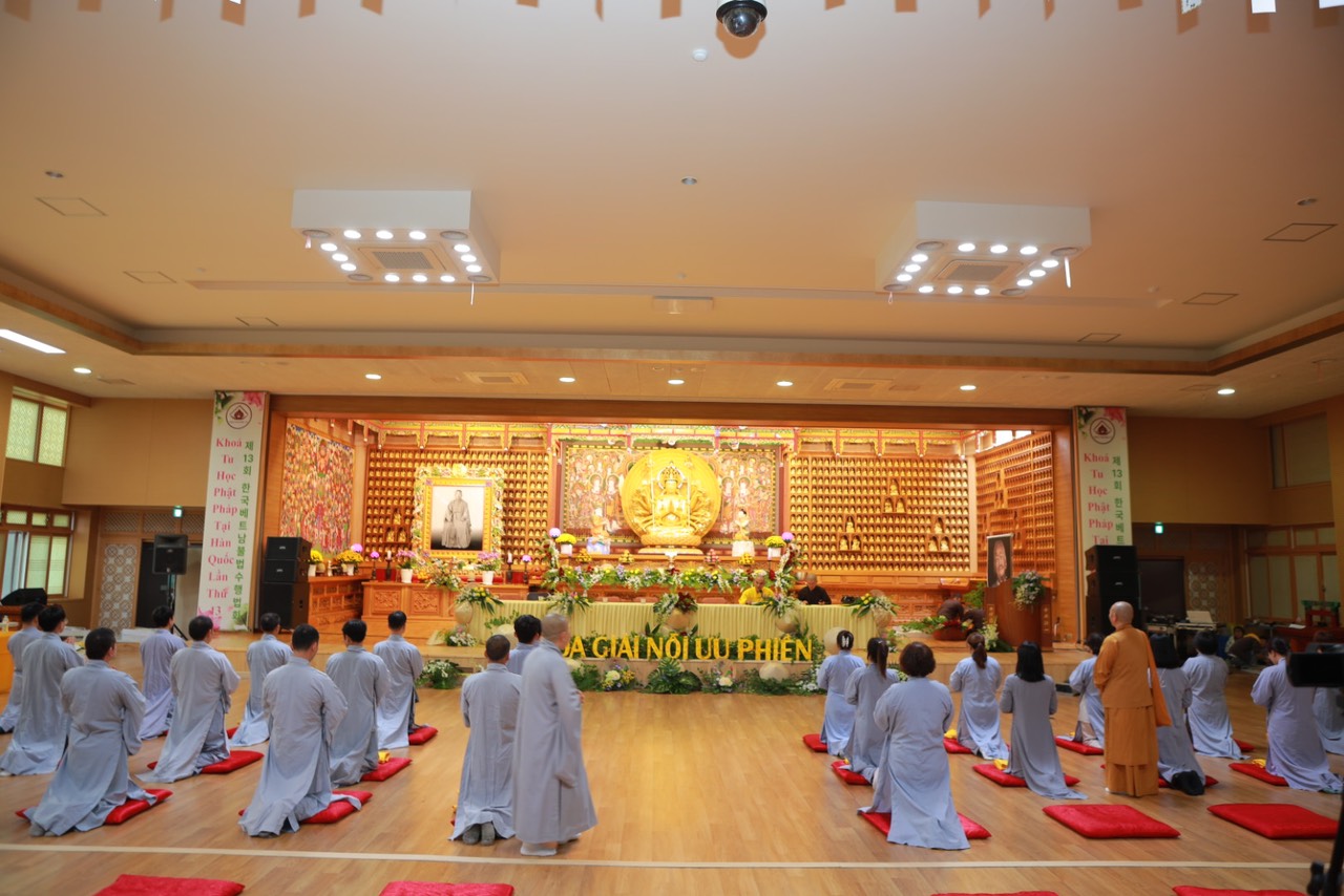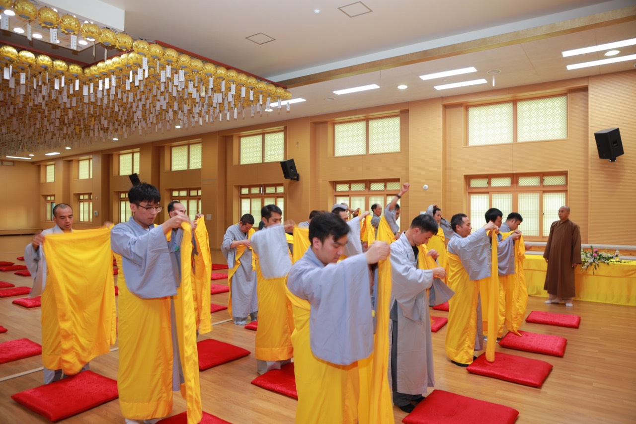 Vào lúc 15h30 phút, với lòng khát ngưỡng, các hành giả Xuất gia gieo duyên trong khóa tu học Phật pháp lần thứ 13 tại Hàn Quốc. Các giới tử đã học thuộc các bài kệ đắp y cũng như kệ lọc nước, dưới sự khảo hạch của chư Tôn đức. Song song đó, các Giới tử tỉnh giác, thực hành các nguyên tắc sống của một người xuất trần thượng sĩ. Quý Thầy Cô Quản giới tử, Thầy Điển lễ tận tình hướng dẫn và trả lời các già nạn trước khi thọ giới, cách đắp y…