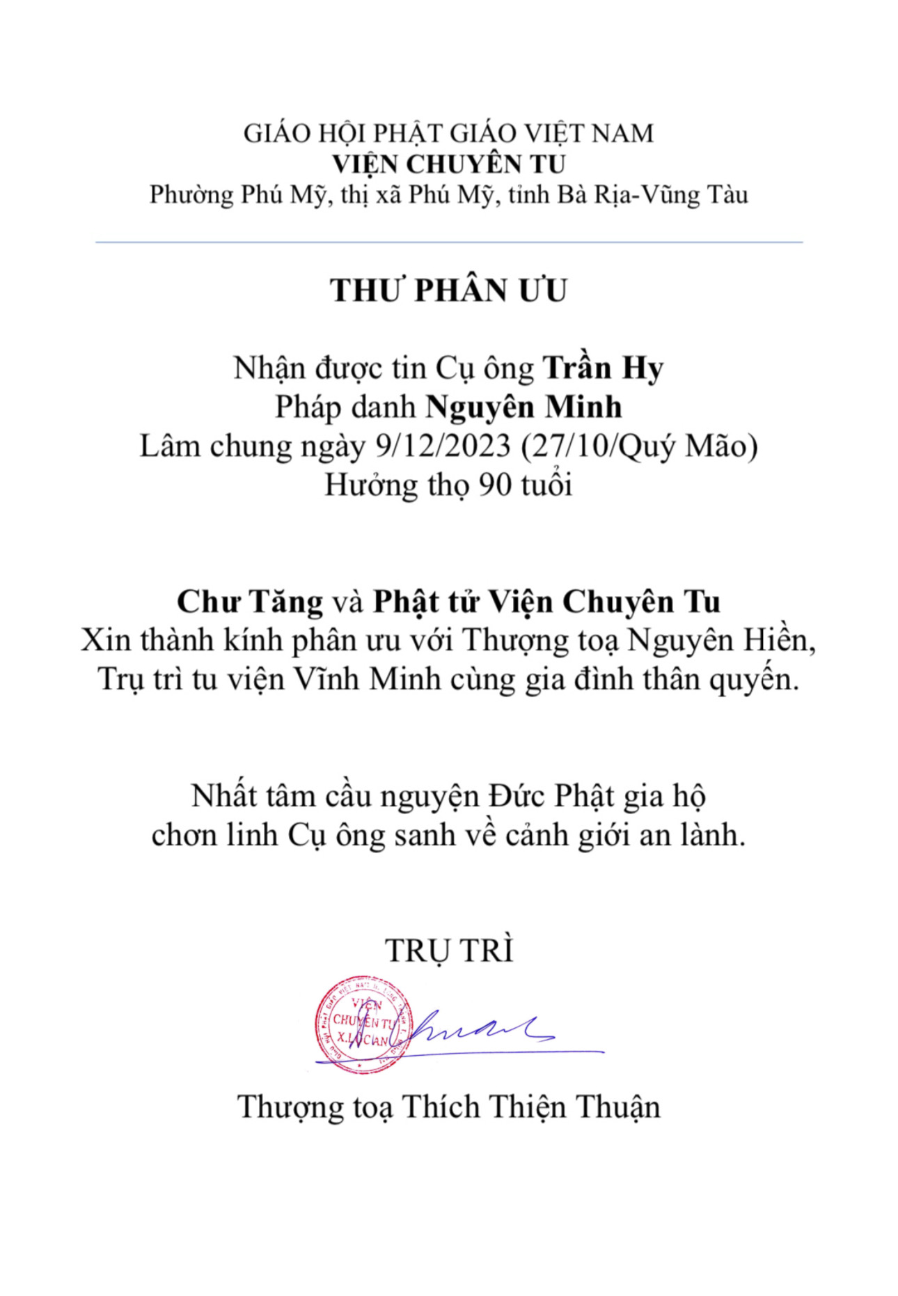 Thư phân ưu cùng Thượng toạ Thích Nguyên Hiền, Trụ trì Vĩnh Minh Tu Viện và gia đình thân quyến.