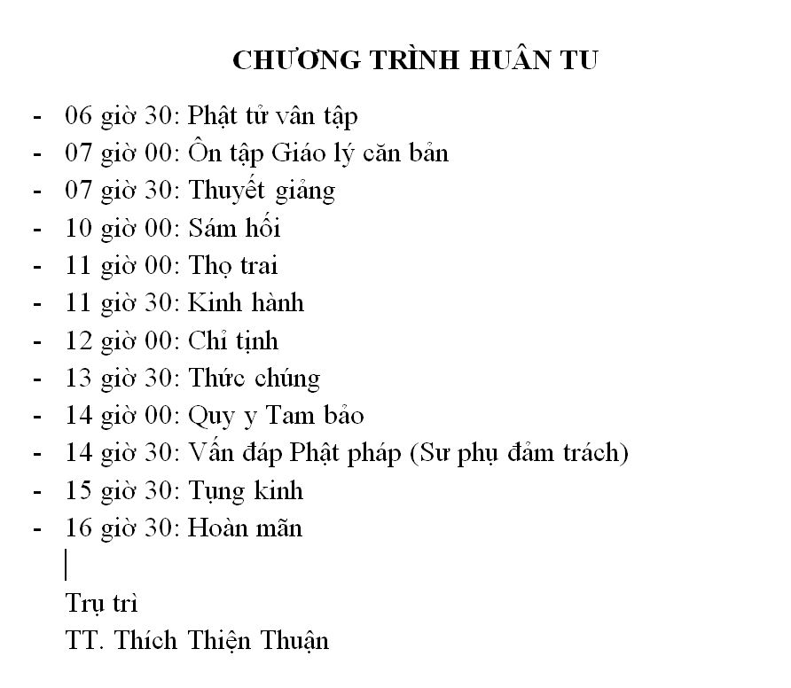 Kính thưa quý nam nữ Phật tử thân mến! theo sự chỉ dạy của Sư phụ Thích Thiện Thuận, chương trình Huân tu sắp tới sẽ có sự thay đổi như sau: