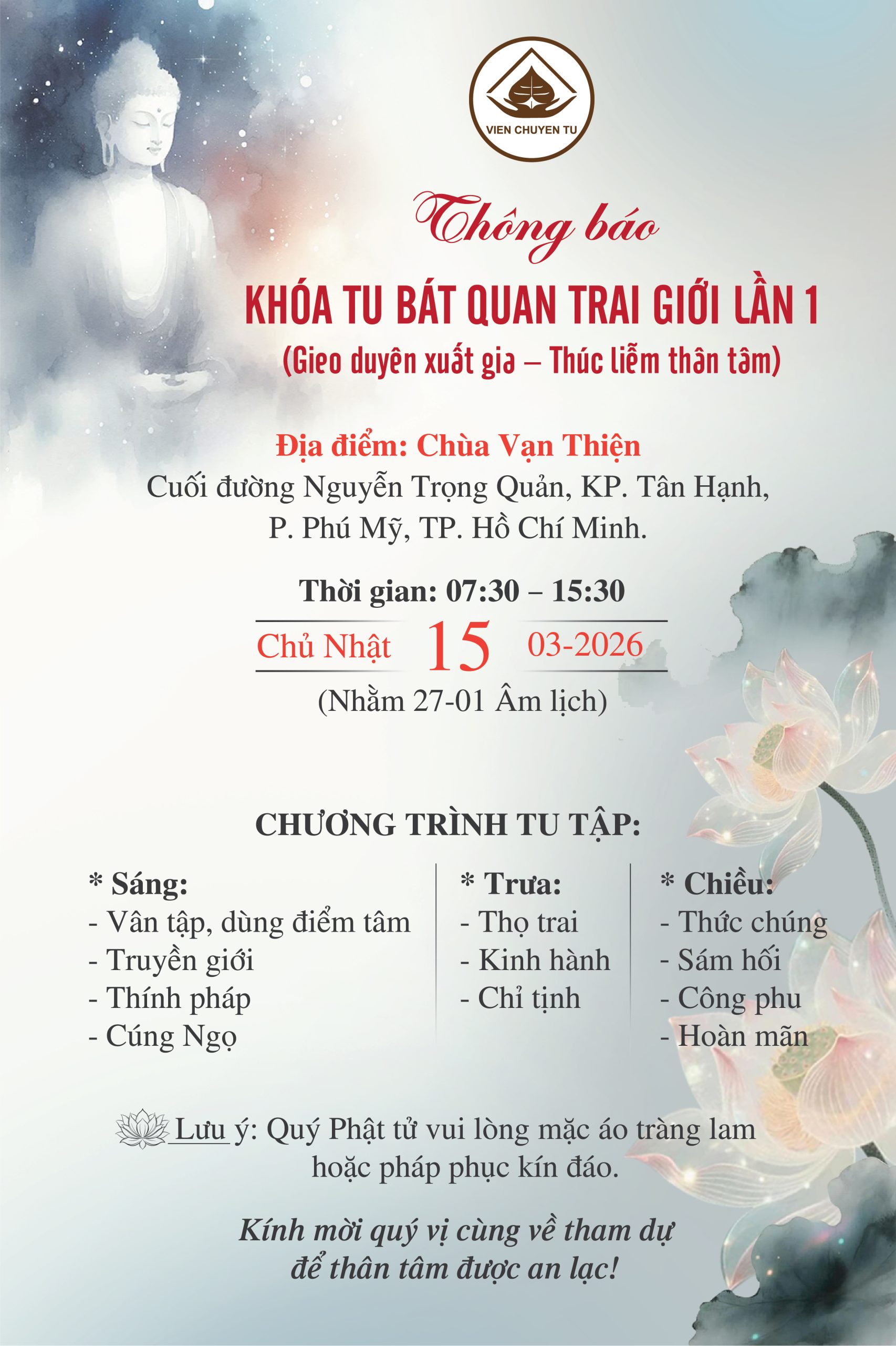 THÔNG BÁO – Về việc Tổ chức Khóa tu Bát Quan Trai Giới lần thứ 1