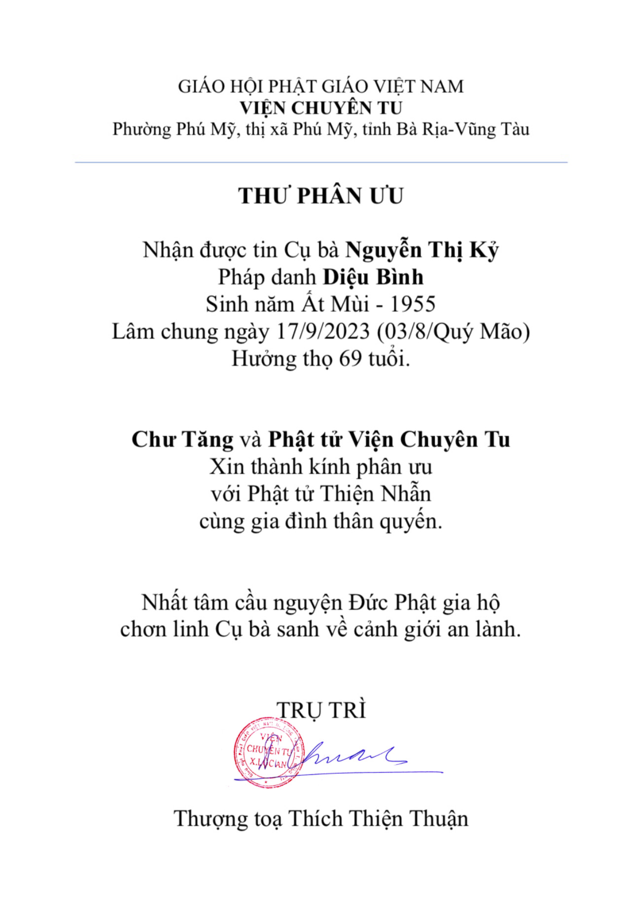 Thư Phân ưu – chia buồn cùng gia đình Phật tử Thiện Nhẫn (Cà Mau)