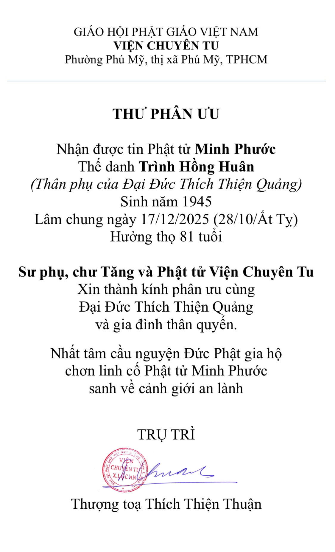 Thư Phân ưu – Chia buồn cùng sự ra đi của cố Phật tử Minh Phước, thân phụ của Đại Đức Thích Thiện Quảng