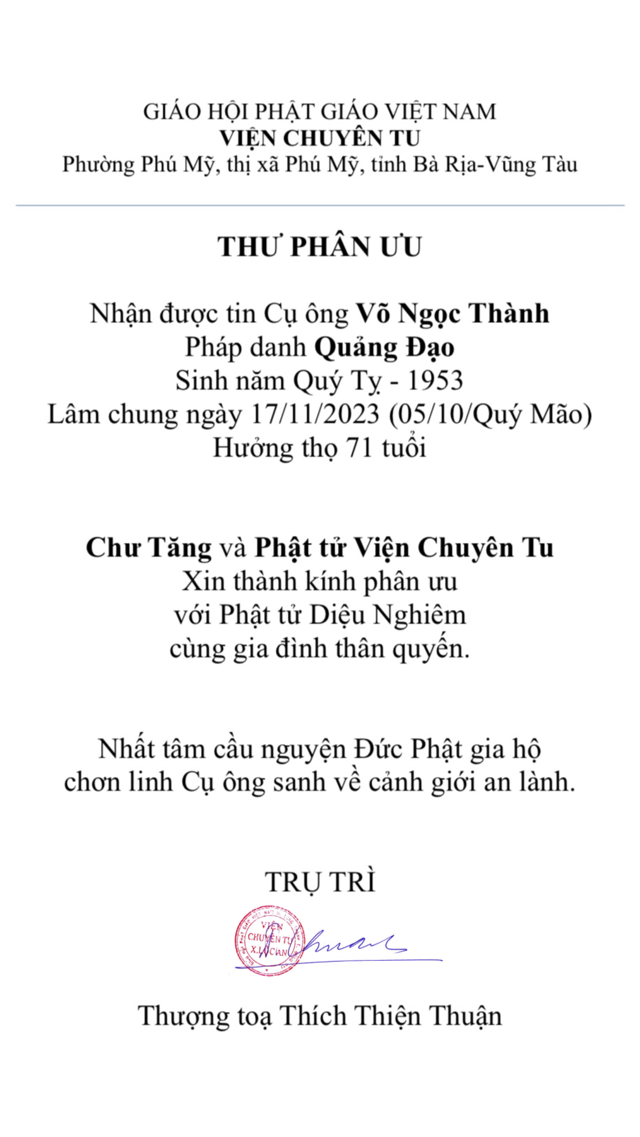 Thư phân ưu cùng gia đình Phật tử Diệu Nghiêm
