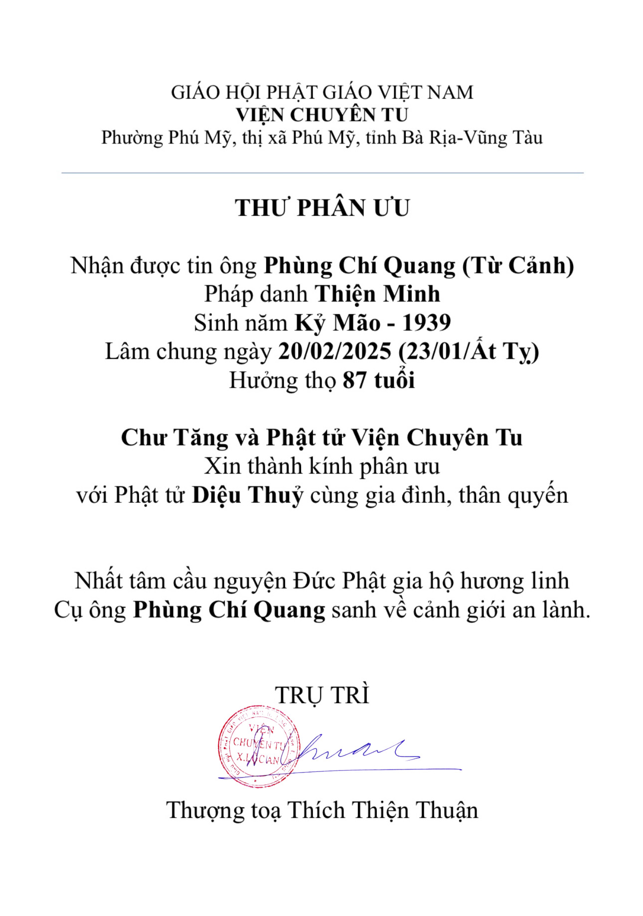 Thư Phân ưu cùng Phật tử Diệu Thuỷ và gia đình thân quyến