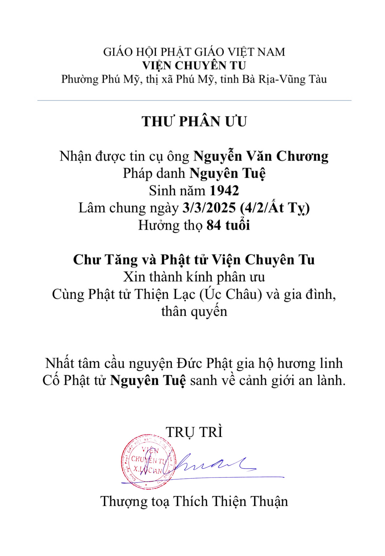 Thư Phân ưu đến Phật tử Thiện Lạc cùng gia đình thân quyến