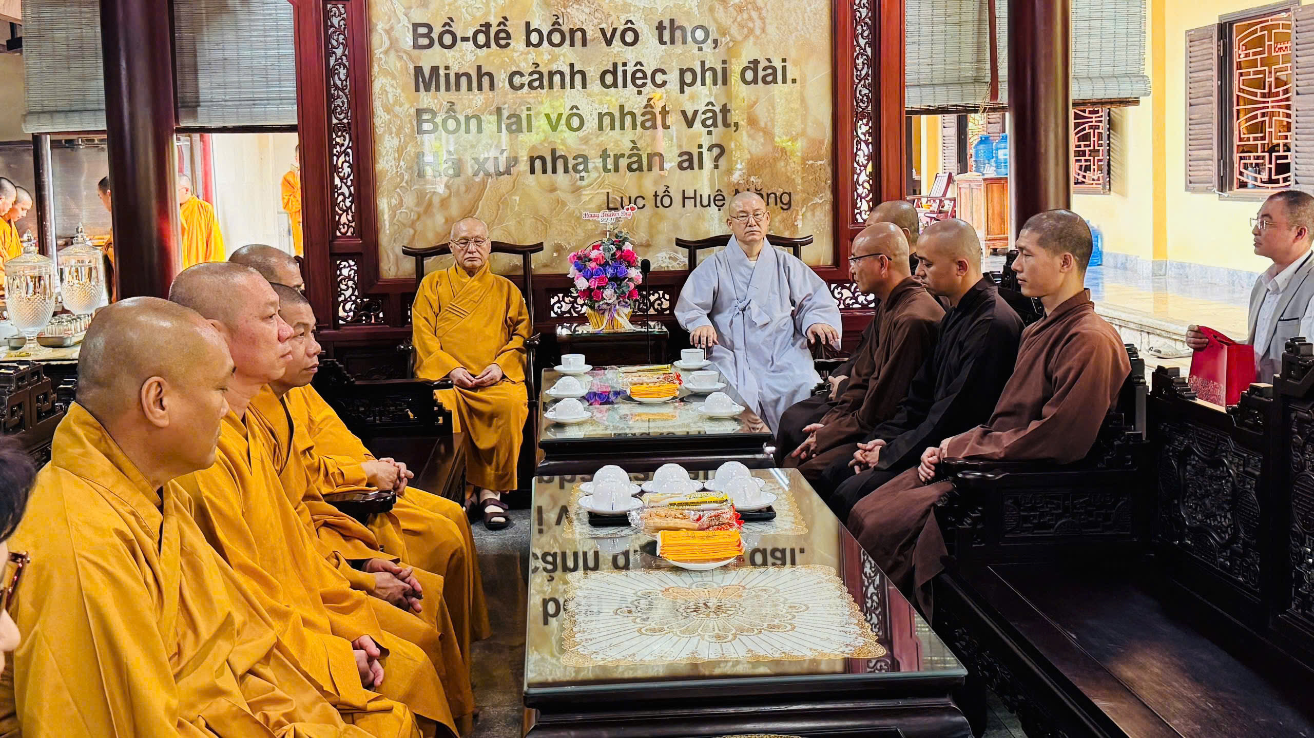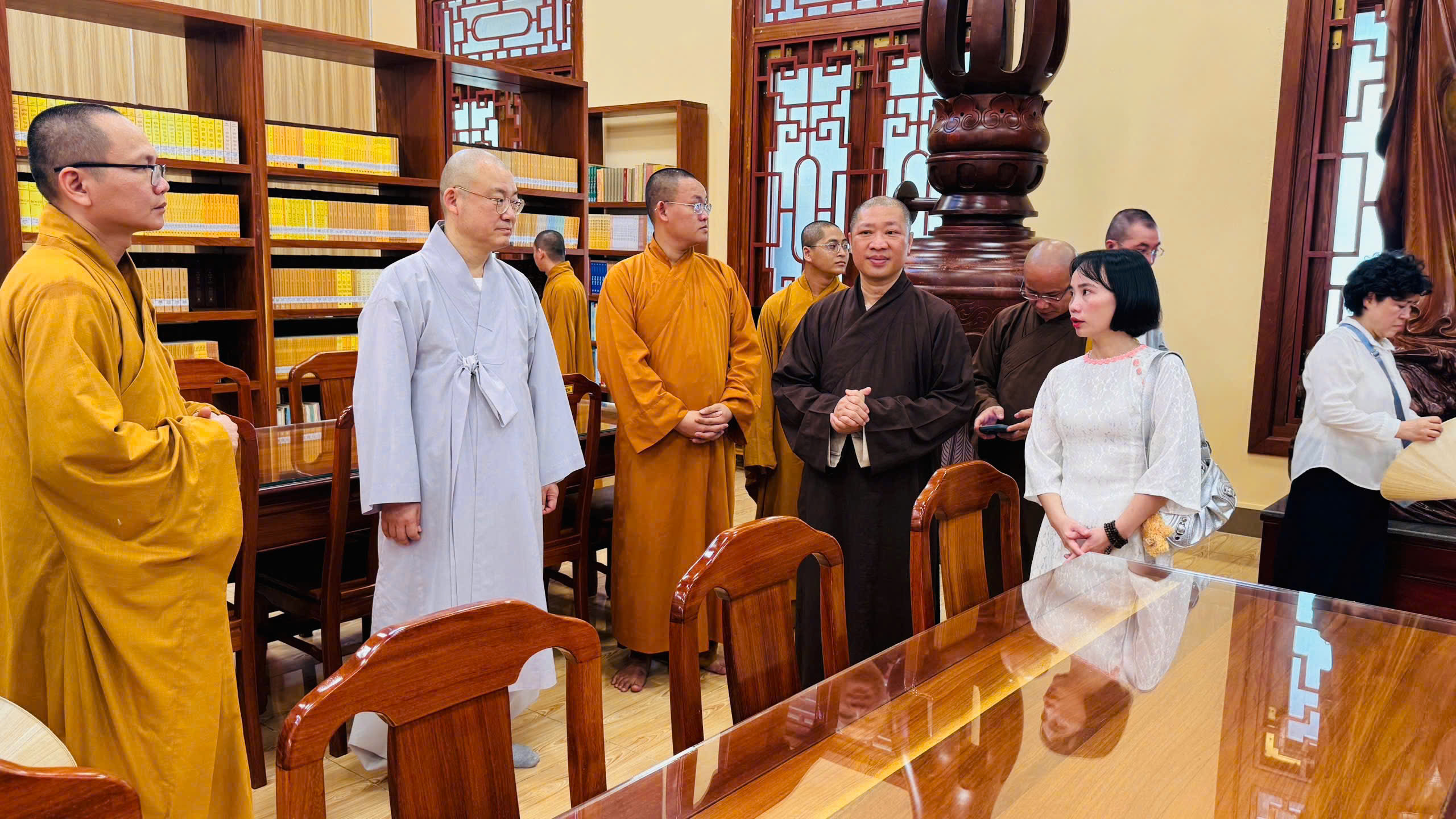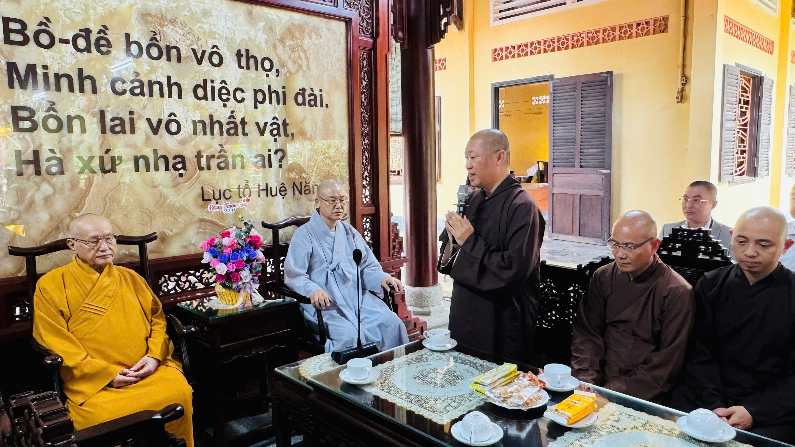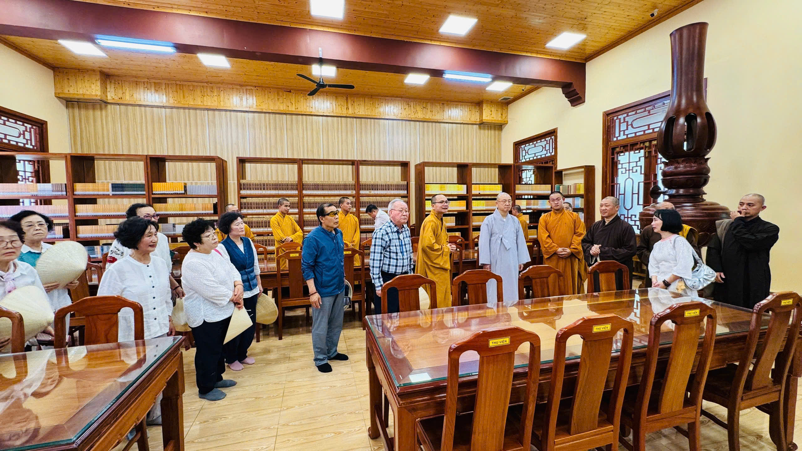 Sau lời chia sẻ và tri ân của Hòa thượng trụ trì chùa Minh Trang, TT. Thích Thiện Thuận đã nhắc lại câu chuyện 30 năm trước, Trưởng lão HT. Thích Nhật Quang là giáo thọ đã từng dạy học Thượng tọa tại trường Phật học Đại Tòng Lâm. Buổi gặp mặt khép lại, đoàn được ĐĐ. Thích Quang Tuệ – Ủy viên HĐTS – Phó BTS – Trưởng Ban giáo dục BTS GHPGVN tỉnh Đồng Nai – phụ trách các trường Trung cấp và Cao đẳng Phật học tại Tổ đình Thiền Viện, hướng dẫn đoàn lễ Phật, thăm mô hình sinh hoạt tại Trường thiền gồm: Trai đường, thiền đường, nhà chúng, thư viện, lớp học,… Đại đức cũng chia sẻ quy trình đào tạo tại Thiền viện khép kín trong 10 năm đến đoàn. Hòa thượng Trụ trì chùa Minh Trang và cả đoàn rất hoan hỉ khi được tham quan tại Tổ đình mong sẽ có dịp quay lại cùng đại cúng tham gia tu học.