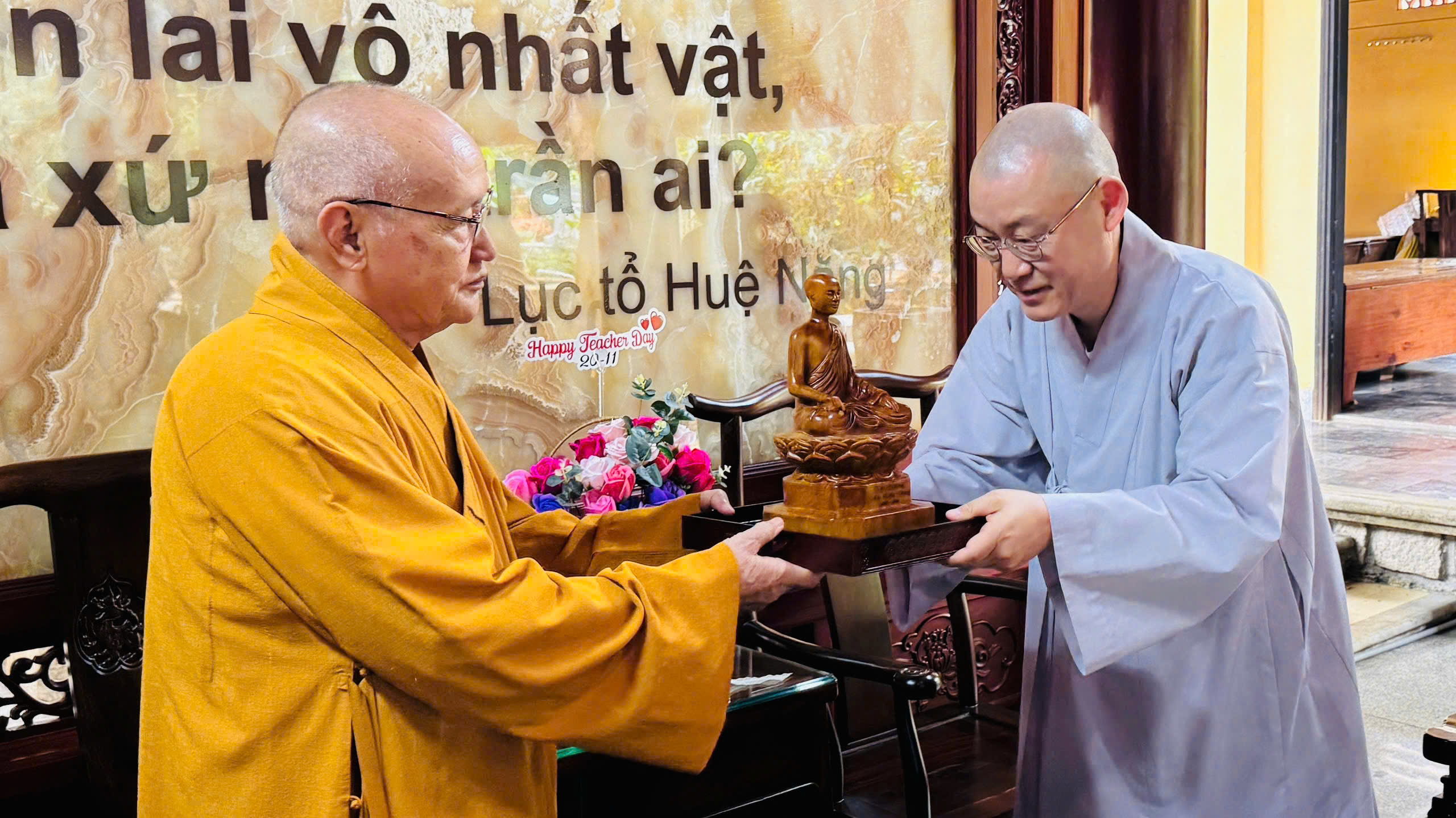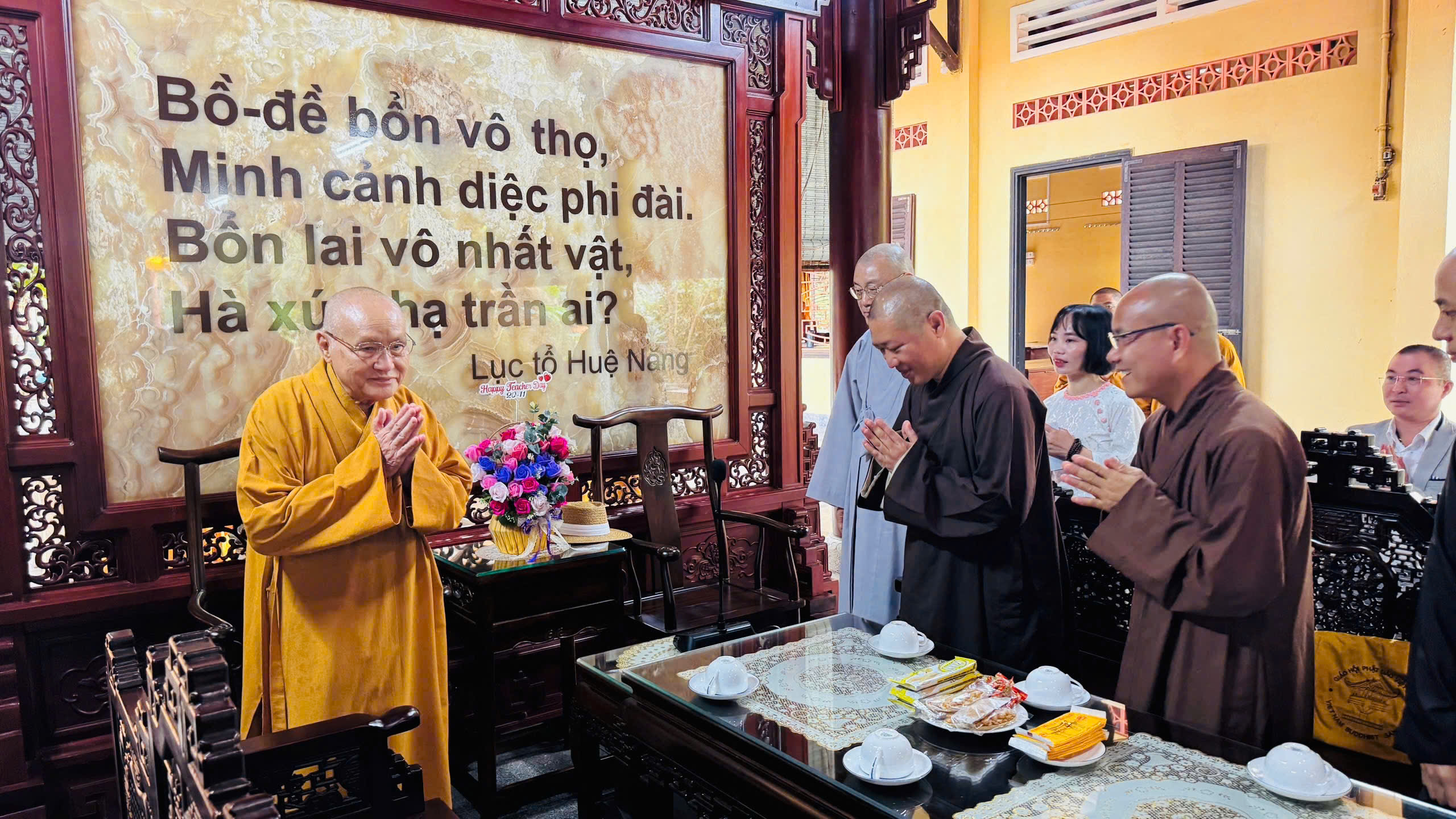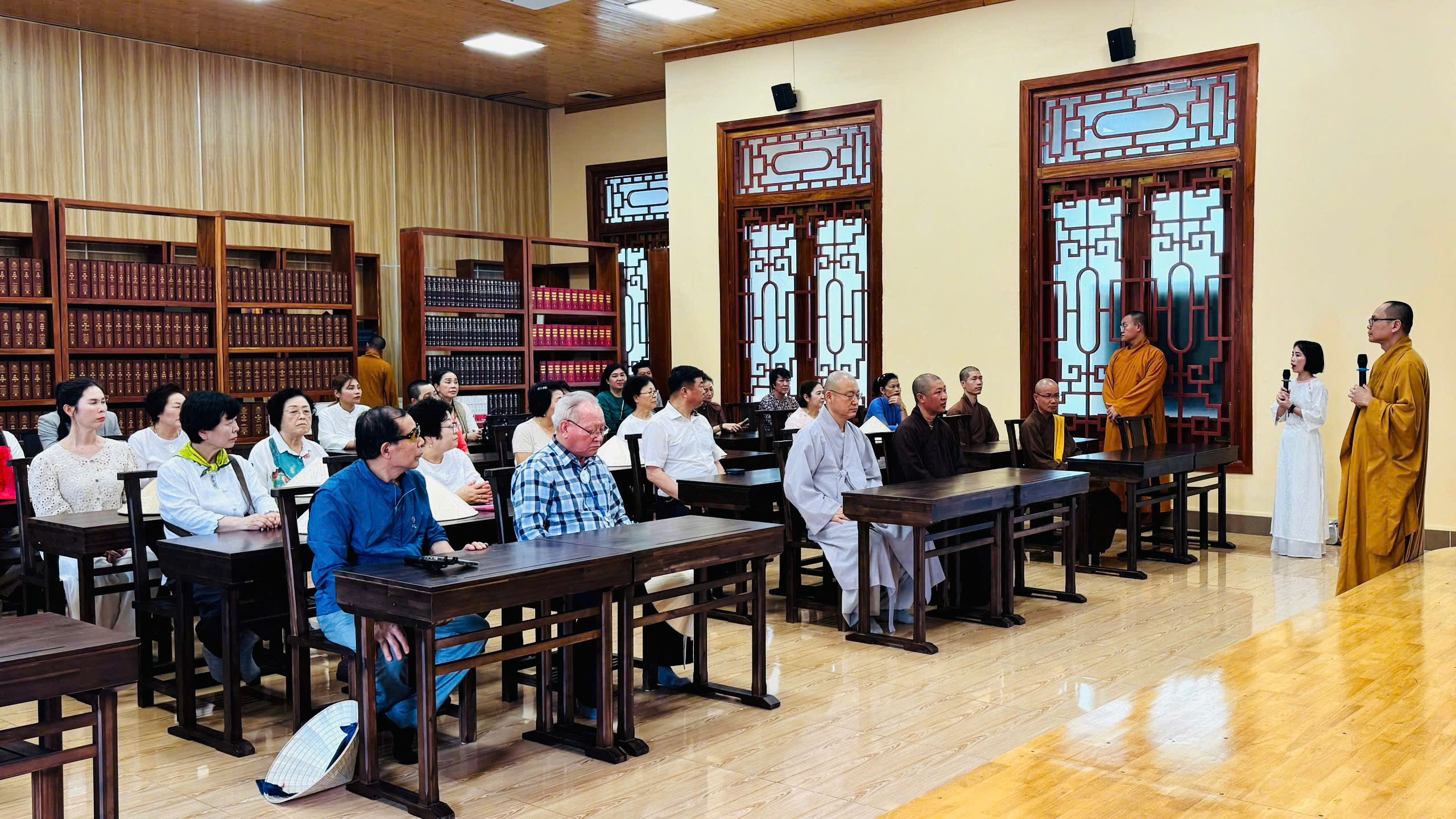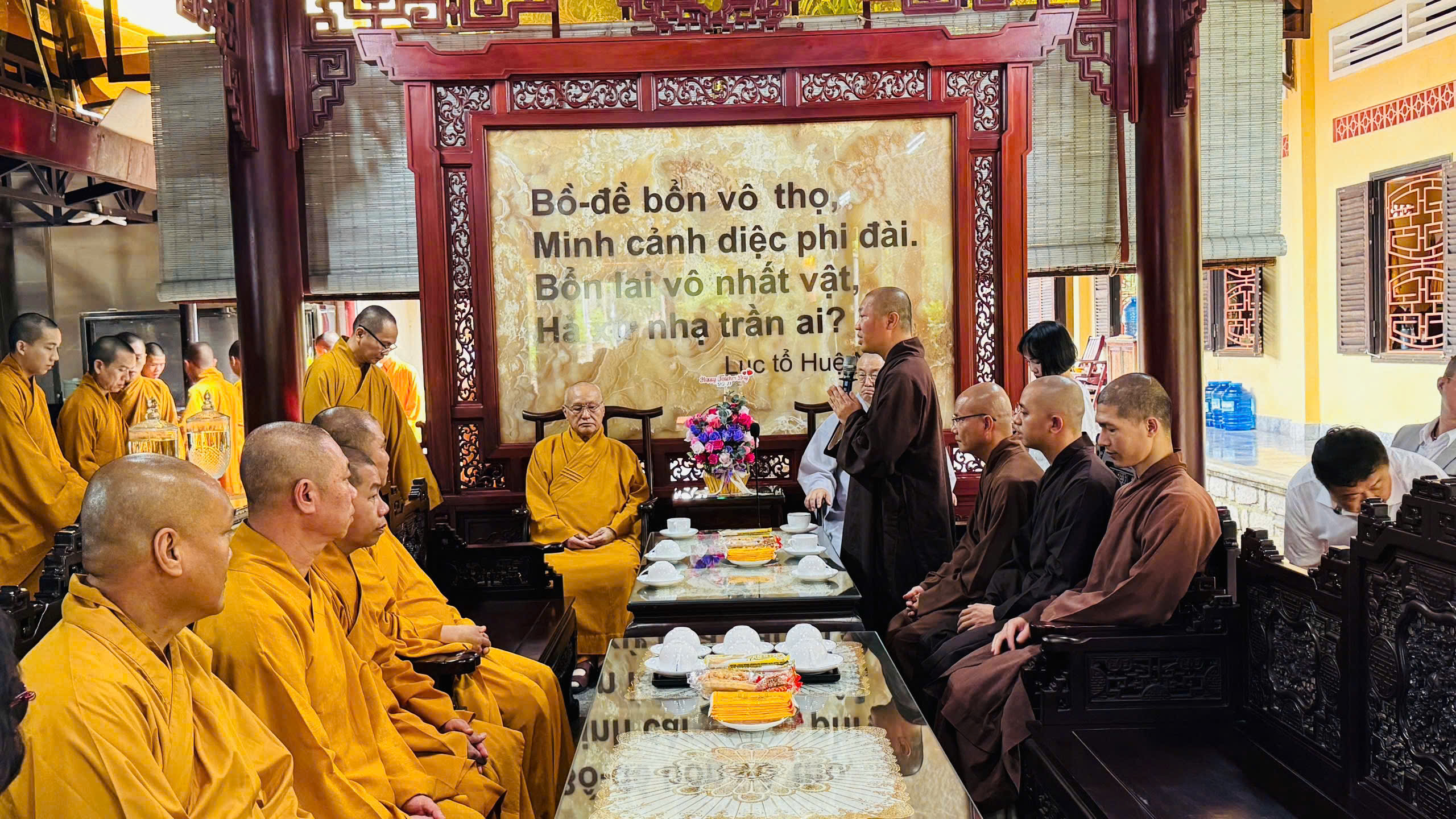 Sau lời chia sẻ và tri ân của Hòa thượng trụ trì chùa Minh Trang, TT. Thích Thiện Thuận đã nhắc lại câu chuyện 30 năm trước, Trưởng lão HT. Thích Nhật Quang là giáo thọ đã từng dạy học Thượng tọa tại trường Phật học Đại Tòng Lâm. Buổi gặp mặt khép lại, đoàn được ĐĐ. Thích Quang Tuệ – Ủy viên HĐTS – Phó BTS – Trưởng Ban giáo dục BTS GHPGVN tỉnh Đồng Nai – phụ trách các trường Trung cấp và Cao đẳng Phật học tại Tổ đình Thiền Viện, hướng dẫn đoàn lễ Phật, thăm mô hình sinh hoạt tại Trường thiền gồm: Trai đường, thiền đường, nhà chúng, thư viện, lớp học,… Đại đức cũng chia sẻ quy trình đào tạo tại Thiền viện khép kín trong 10 năm đến đoàn. Hòa thượng Trụ trì chùa Minh Trang và cả đoàn rất hoan hỉ khi được tham quan tại Tổ đình mong sẽ có dịp quay lại cùng đại cúng tham gia tu học.