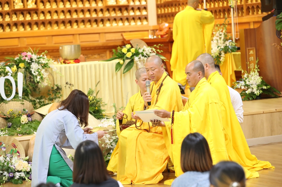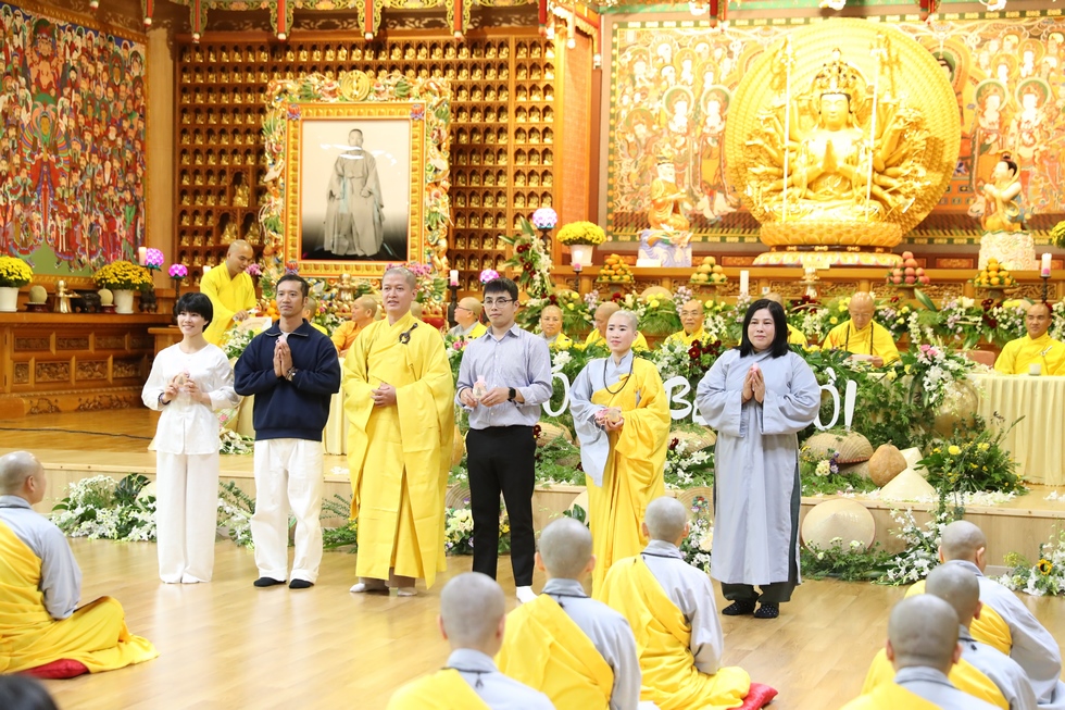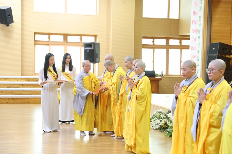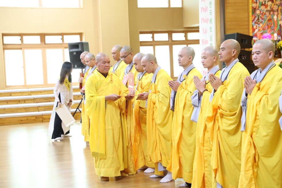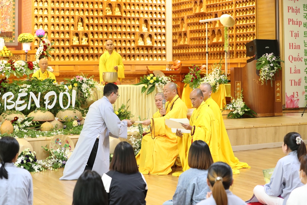 Sau đó TT. Thích Thiện Thuận – Trưởng BTC khóa tu cùng Chư Tôn đức đã thực hiện nghi thức truyền trao Tam quy ngũ giới cho hơn 100 vị thiện nam và tín nữ người Việt lẫn người Hàn phát tâm lãnh thọ. Các giới tử hân hoan đón nhận giới pháp. Chuỗi sự kiện diễn ra vào buổi sáng, trong không gian ấm áp thấm tình đạo vị, những ân tình bao la rộng lớn của quý Tôn đức, đã đọng lại nhiều kỷ niệm đẹp khó phai trong lòng quý nam nữ Phật tử từ nhiều nơi vân tập về đây tham dự khóa tu học lần thứ 13 này.