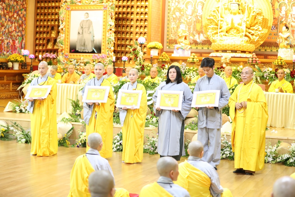 Tiếp nối buổi tọa đàm, ĐĐ. Thích Thiện Hưng điều phối chương trình trao bằng tuyên dương công đức cho các tiểu ban trong Ban tổ chức đã có nhiều đóng góp về tài lực, trí lực và sức lực cho khóa tu học được thành công tốt đẹp; phát giấy chứng nhận cho 27 giới tử xuất gia gieo duyên và tặng quà thi giáo lý cho 5 hành giả đạt kết quả cao trong hội thi vào chiều ngày 28/10/2023.