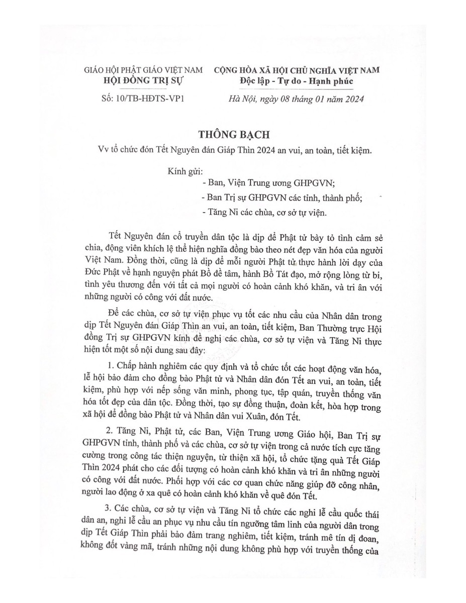 Để các chùa, cơ sở tự viện phục vụ tốt các nhu cầu của Nhân dân trong dịp Tết Nguyên đán Giáp Thìn an vui, an toàn, an lạc, Ban Thường trực Hội đồng Trị sự kính đề nghị các chùa, cơ sở tự viện và Tăng Ni thực hiện tốt một số nội dung sau đây: