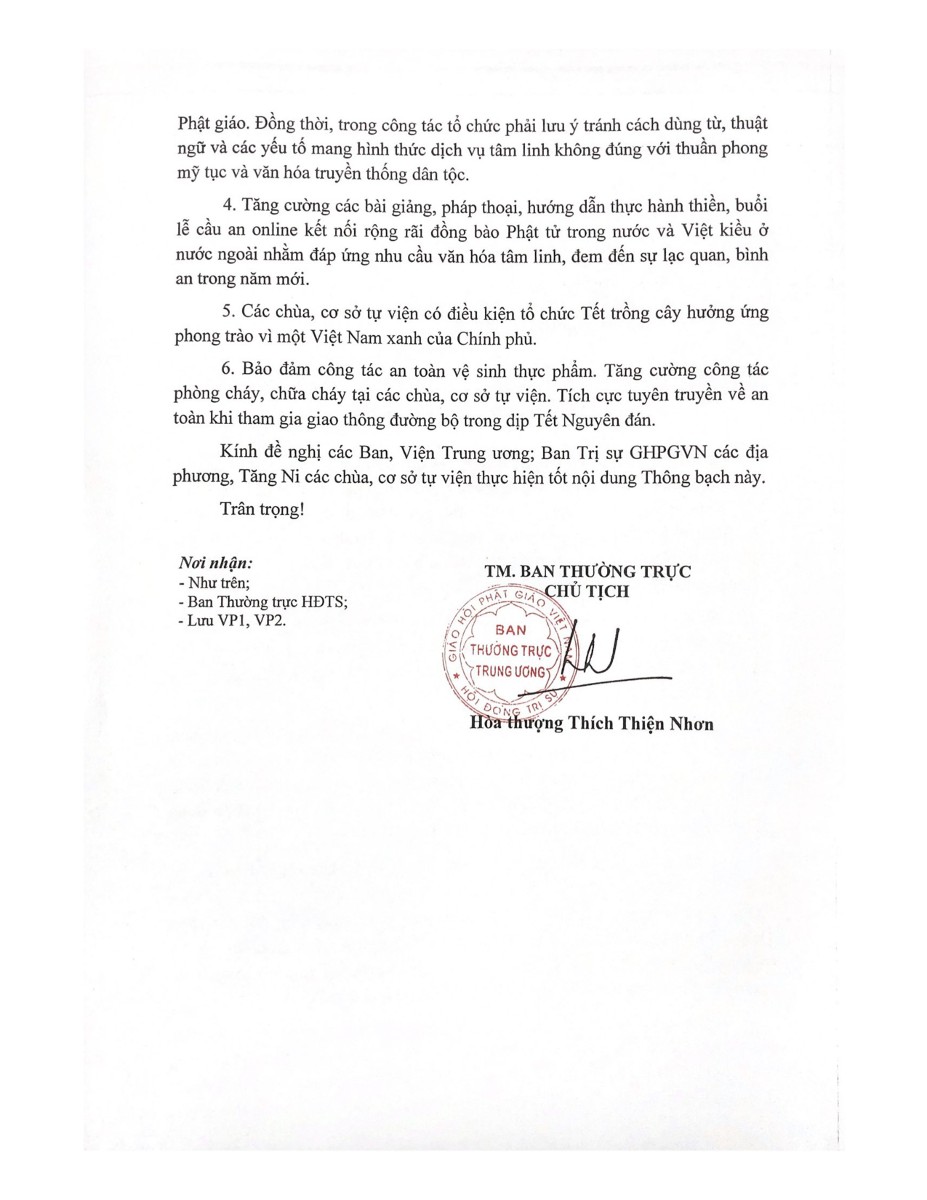 Kính đề nghị các Ban, Viện Trung ương; Ban Trị sự GHPGVN các địa phương, Tăng Ni các chùa, cơ sở tự viện thực hiện tốt nội dung Thông bạch này.
